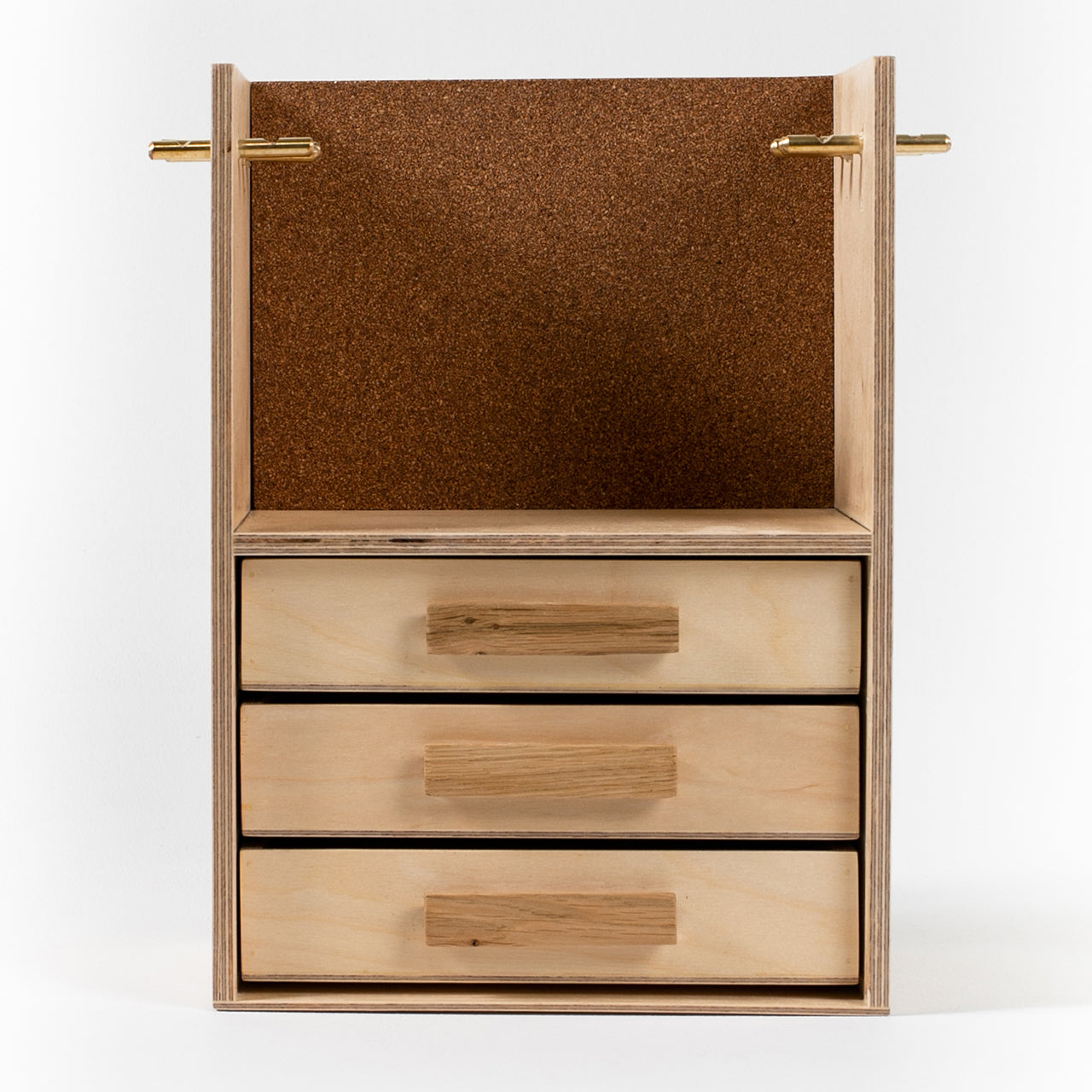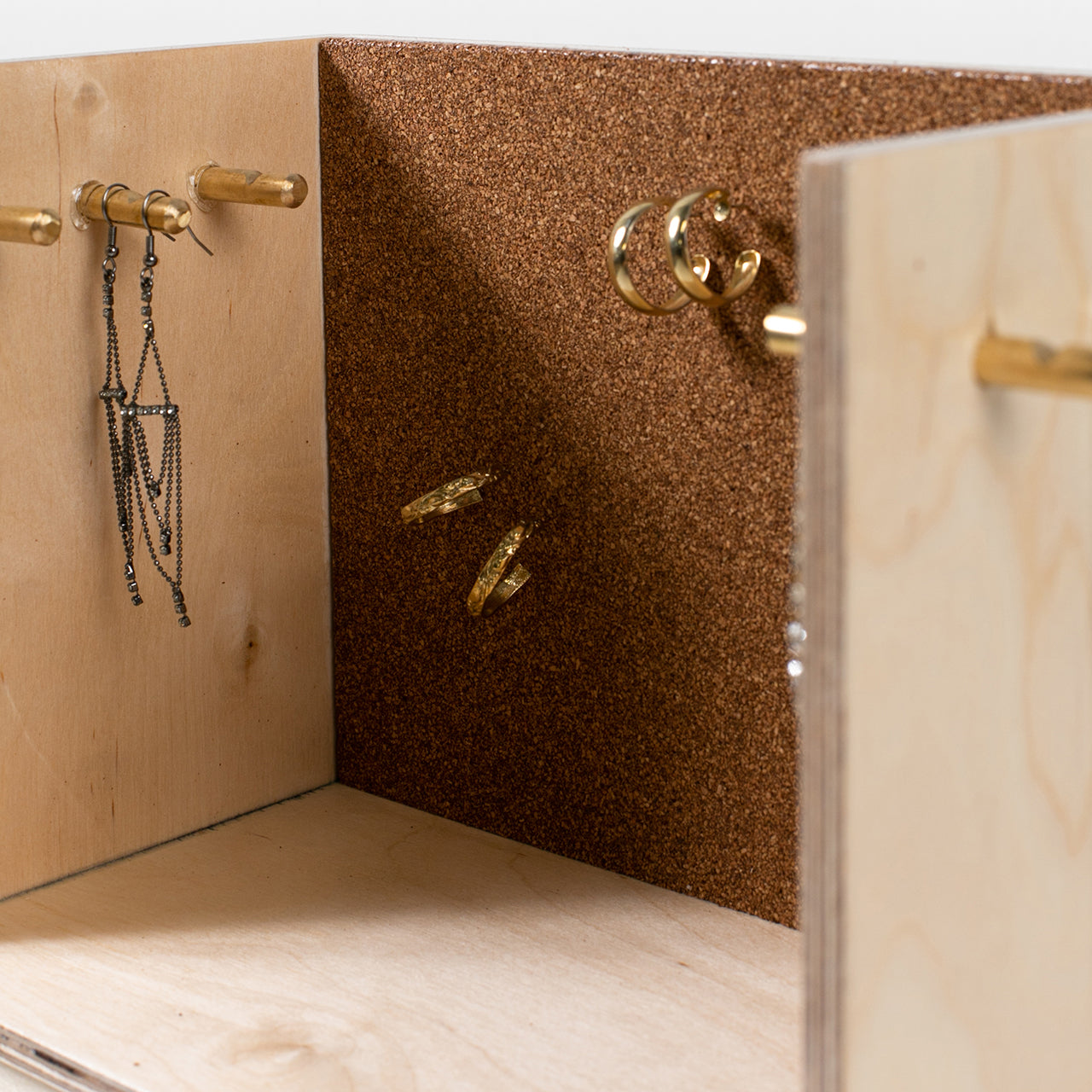 Organise all your cherished accessories and jewels in our hand-crafted jewellery stand. Pierce the cork for all those small but precious studs and hoops. Hang your necklaces on the brass pins for your elegant pieces to be on display. Three drawers, each with a plastic divider box included, helps to keep all your small items organized.